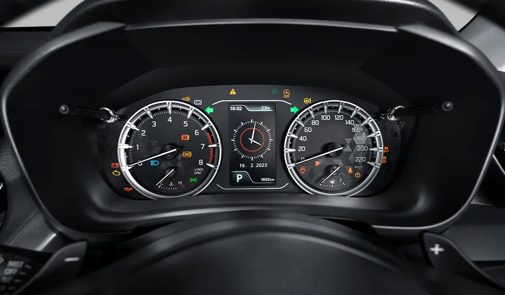 Equipped with a modern Multi-Information Display (MID) alongside sleek speedometers, providing clear and